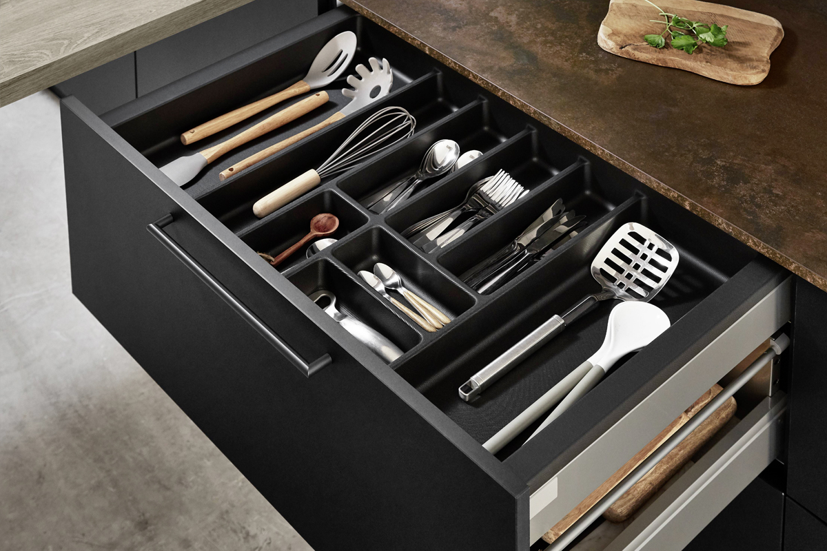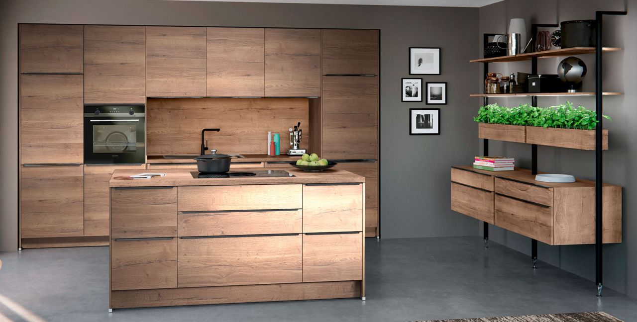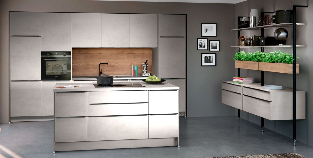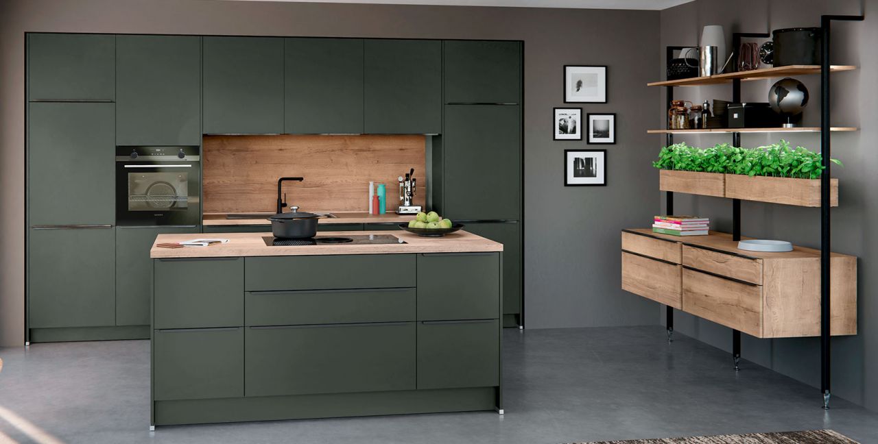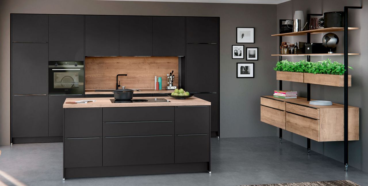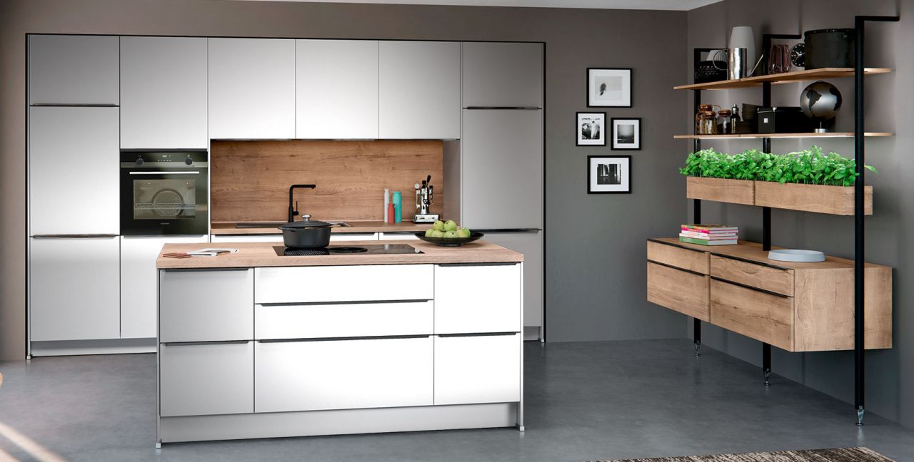 Inklusive Einbaubackofen Edelstahl Siemens HB517ABS0 Energieeffizienzklasse A, Glaskeramik Kochfeld mit Induktion und Kochfeldabzug (Umluft) Bora GP4U, Kühlschrank Junker JC30KCSE0 Energieeffizienzklasse E, Einbauspüle Edelstahl Rodi Okio Line 85 Deep, Stollenregalsystem, Unterschränken mit Großraumauszügen.
