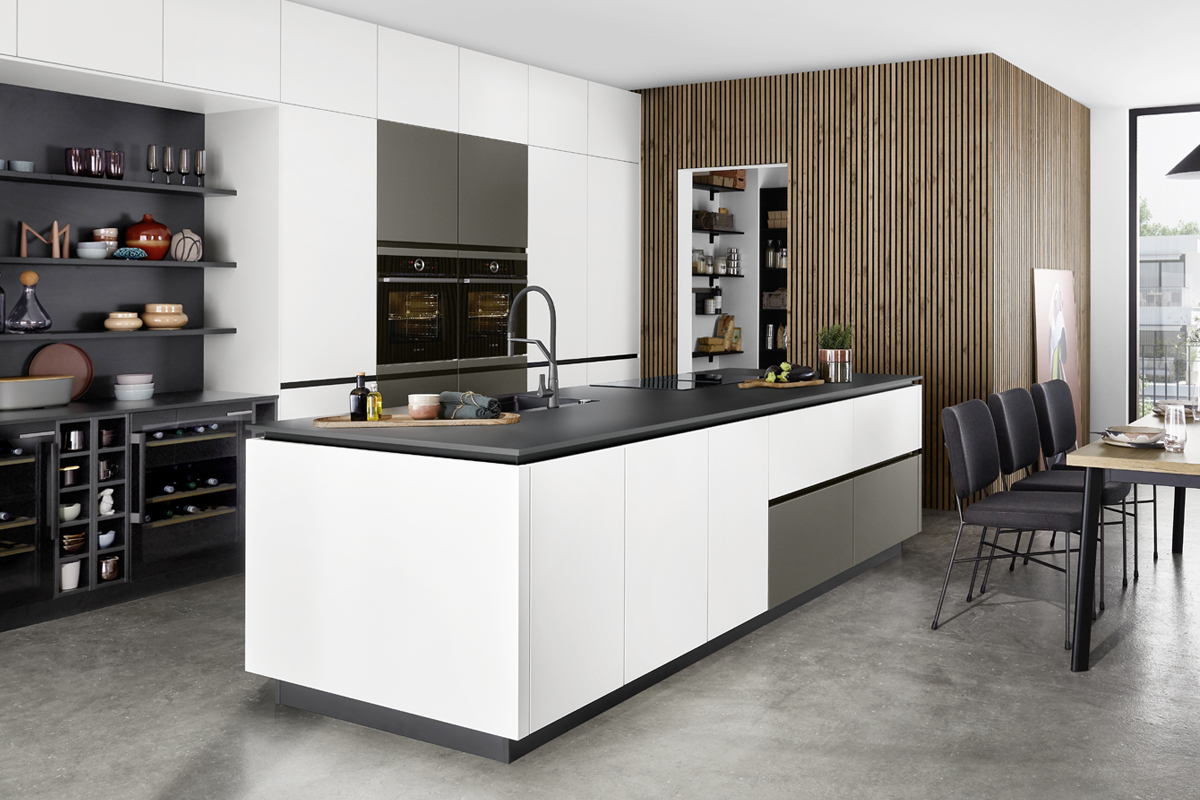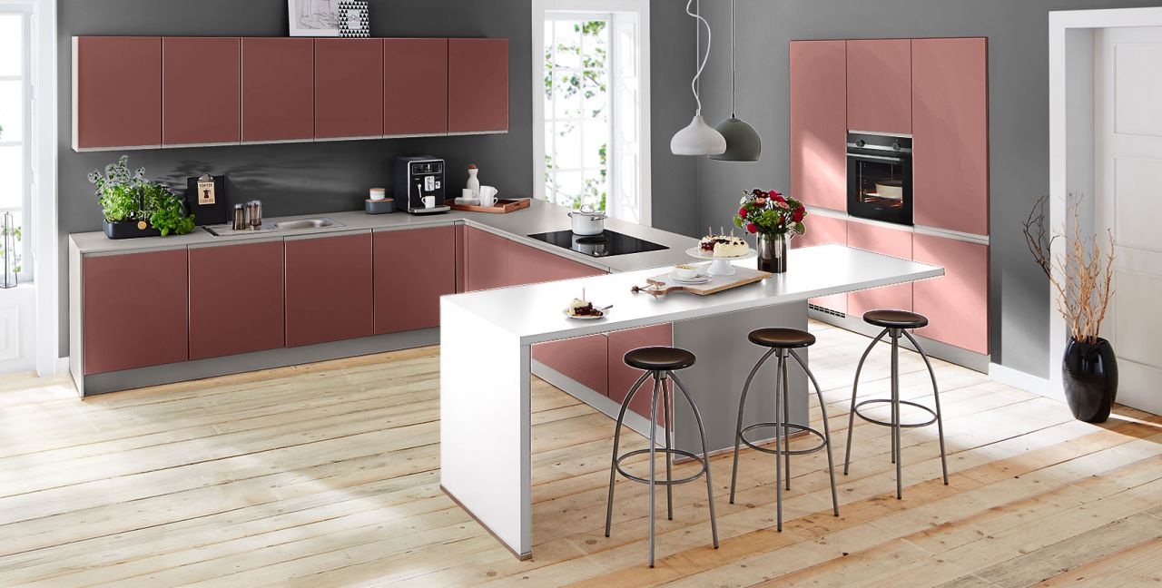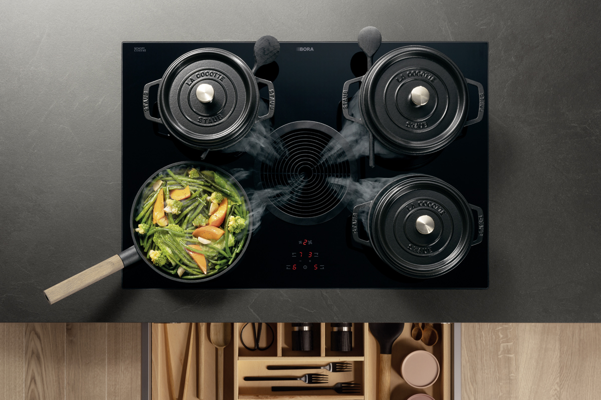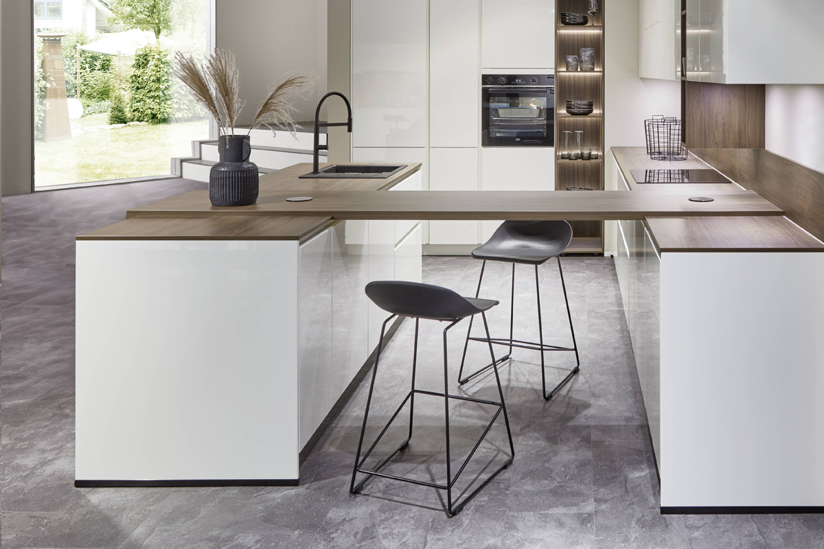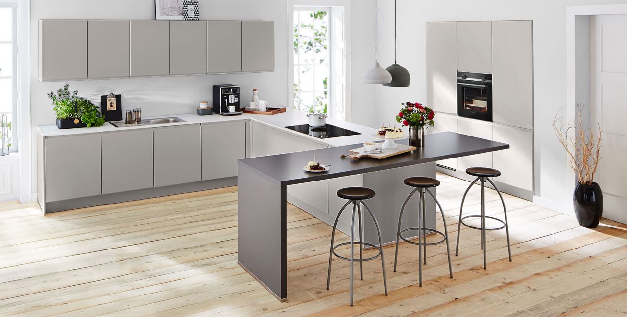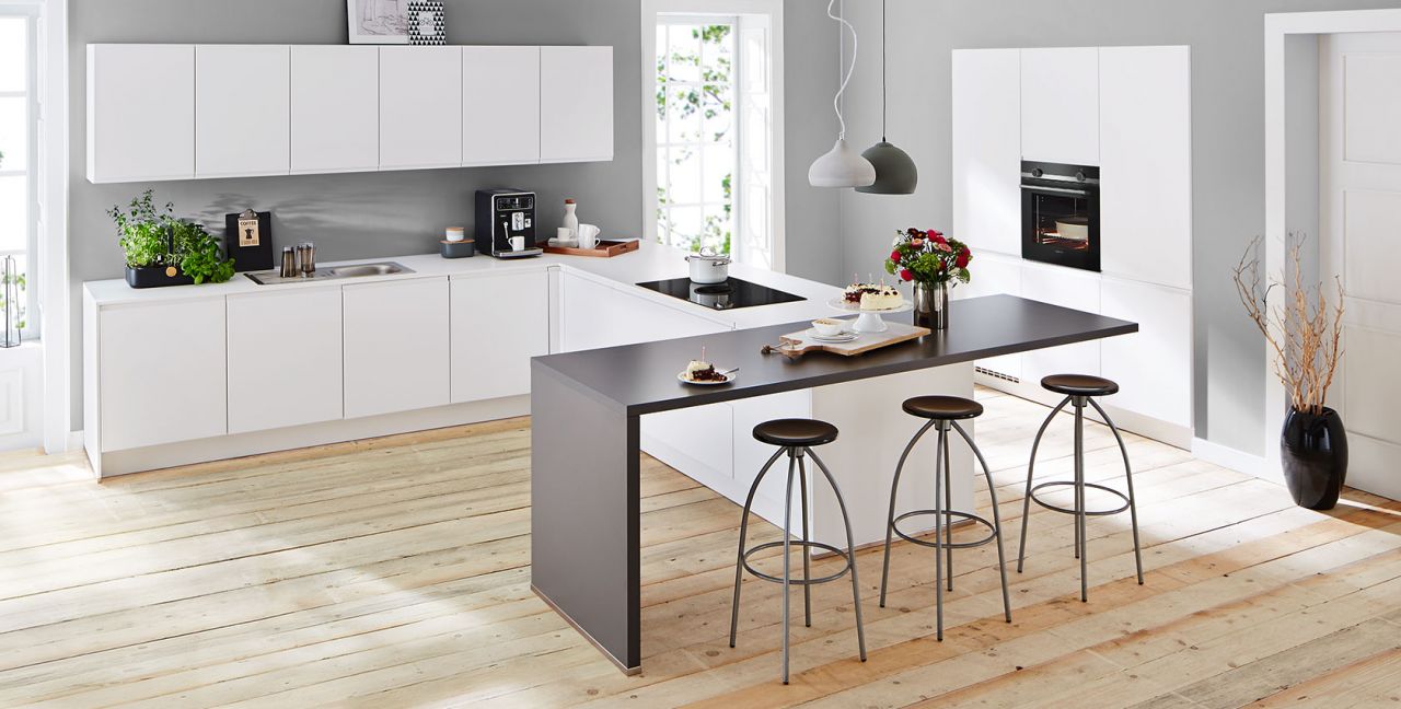 Inklusive Einbaubackofen Edelstahl Siemens HB510ABR1 Energieeffizienzklasse A, Glaskeramik Kochfeld mit Induktion und Kochfeldabzug (Umluft) Bora GP4U, Kühlschrank Junker JC20KCSE0 Energieeffizienzklasse E, Einbauspüle Edelstahl Rodi Okio Line 85 Deep, Esstheke.